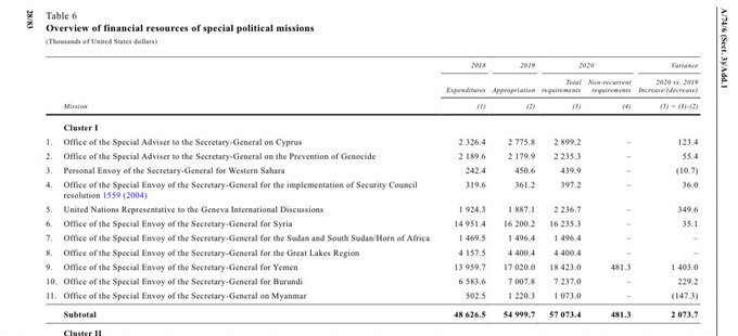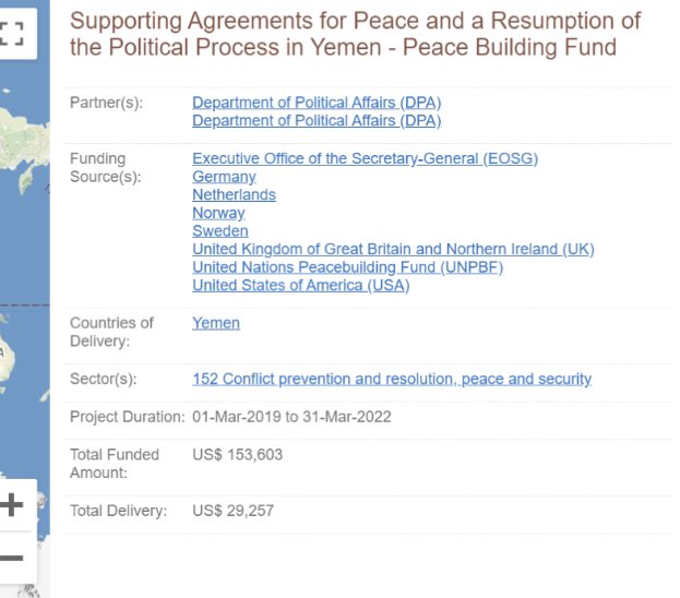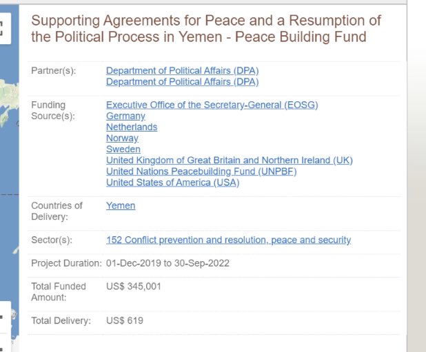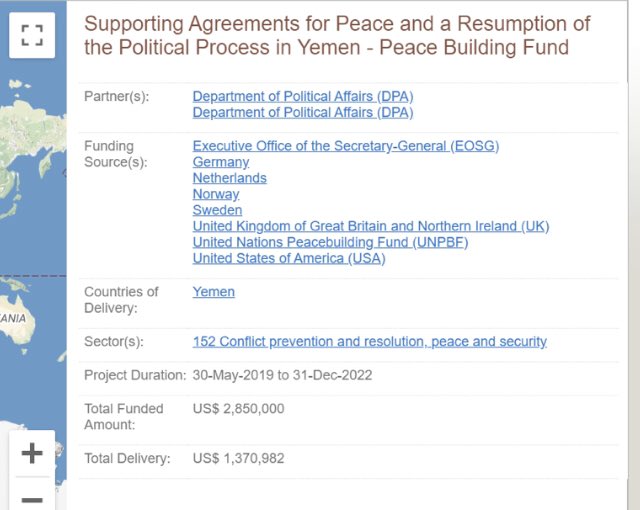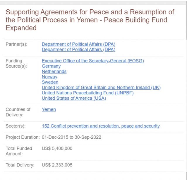 وتشير تلك الوثائق أن الأمم المتحدة، خصصت نحو 9 ملايين دولار لبند أسمته إعادة إحياء المفاوضات ووضع مقترحات للحل وإعادة إحياء العملية السياسية، حتى نهاية 2022، وهو ما يعني أن الأمم المتحدة غير جادة في إنهاء الصراع وإحلال السلام في اليمن وفقًا للمرجعيات الثلاث، قبل الفترة التي حددتها.
