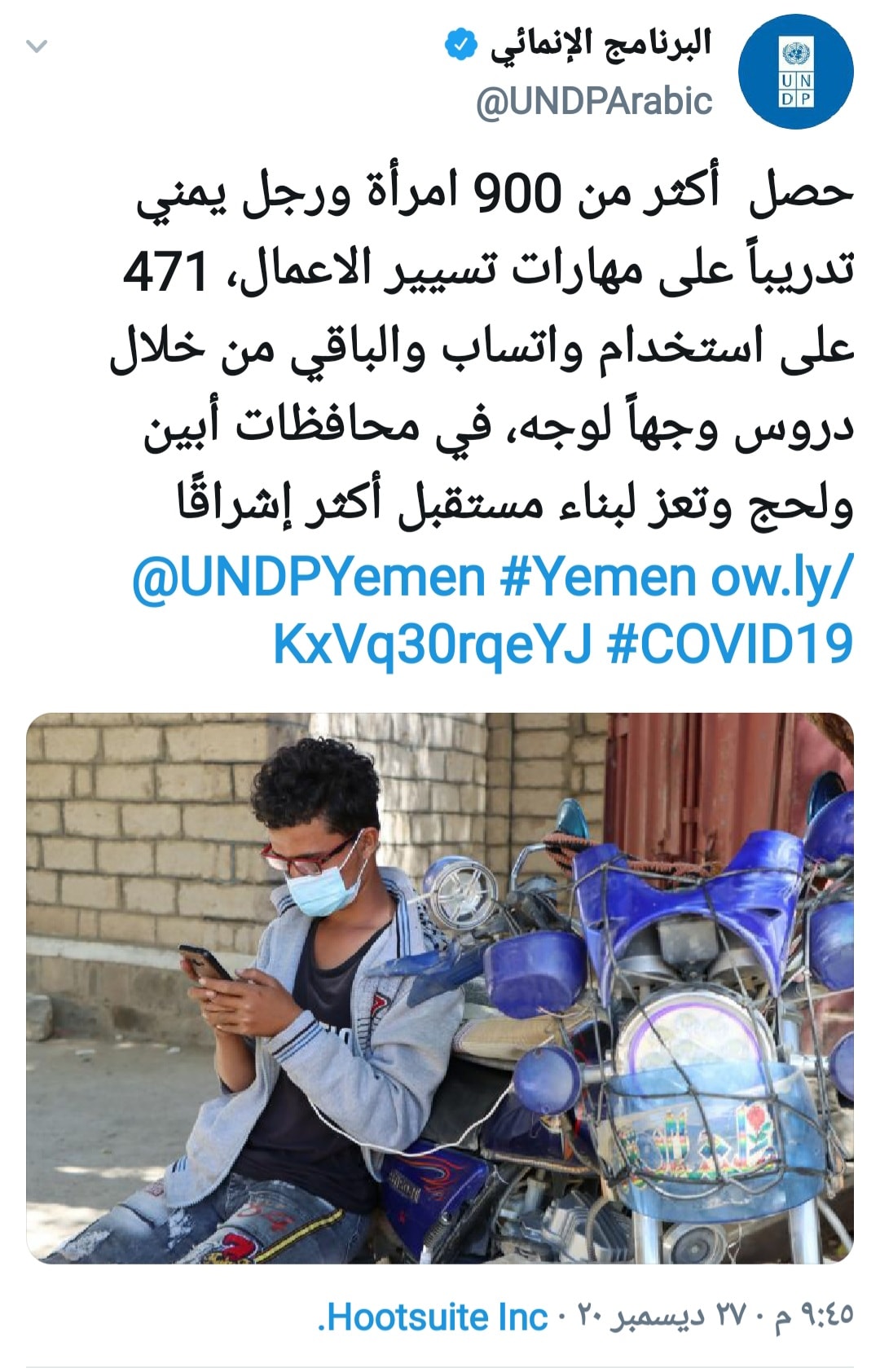 وأعلن البرنامج الإنمائي التابع للأمم المتحدة، حصول أكثر من 900 يمني، من الجنسين على دورات في مجال مهارات تسيير الأعمال، بينها، دورات على استخدام تطبيق الواتس آب يقول إنها من أجل بناء مستقبل أكثر إشراقاً.