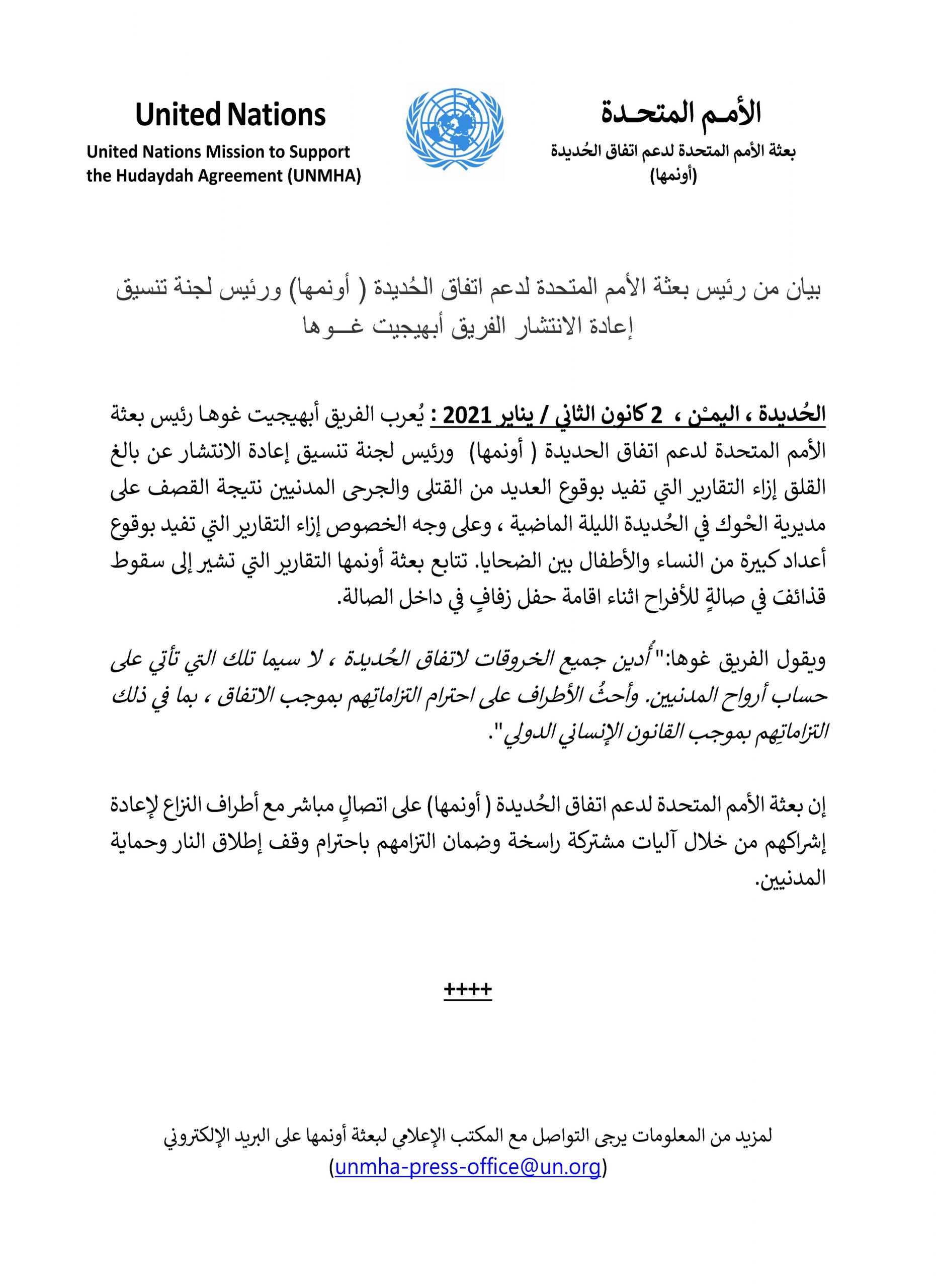 قال رئيس بعثة الأمم المتحدة لدعم اتفاق الحديدة (أونمها)، أبهيجيت جوها، أن المدنيين الذين قتلوا في صالة الأفراح الجمعة 1 يناير 2021، بمحافظة الحديدة، كانت نتيجة قذائف أطلقت على قاعة الأعراس.