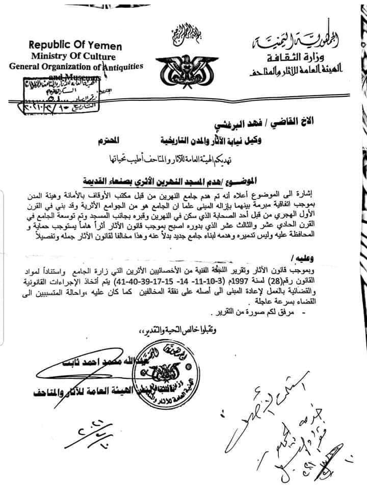 وذكرت مصادر محلية في صنعاء أن عملية الهدم تمت بناءً على اتفاق بين وزارة الأوقاف الخاضعة لسيطرة المليشيات الحوثية، مع مستثمر حوثي لإزالة معالم المسجد الذي بني في العام الأول للهجرة وتمت توسعته فيما بعد.