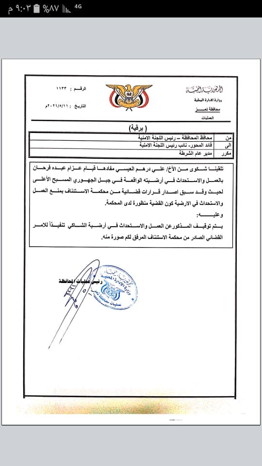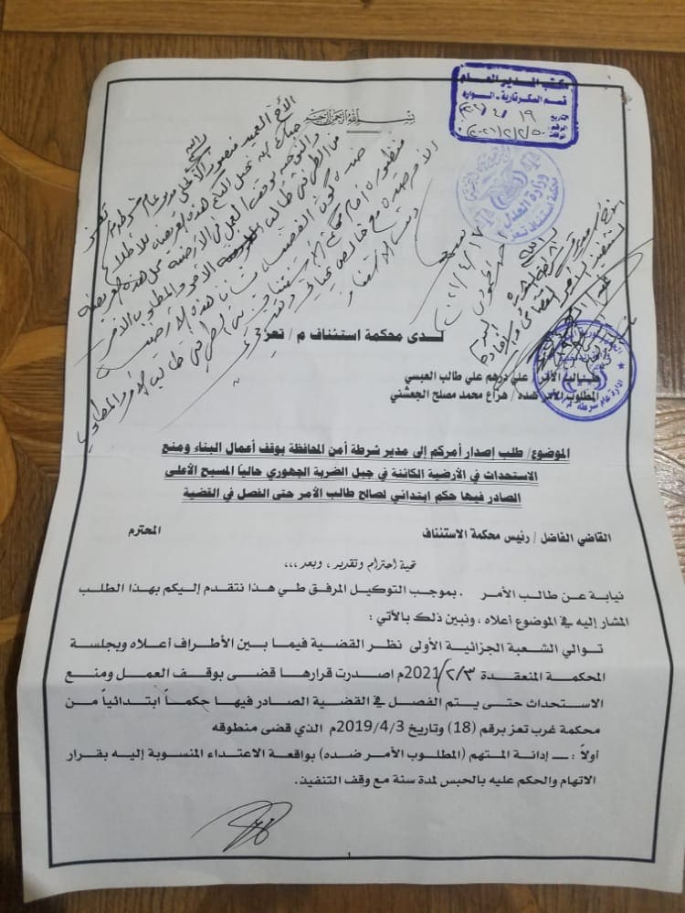 ووفق المصادر، وأكدته مذكرة، فإن محافظ تعز، وجه قائد المحور بتنفيذ أمر محكمة الاستئناف بإيقاف العمل في الأرضية التي نهبها المتنفذ “عزام عبده فرحان” بدعم من والده ويقوم بالبناء بها، مشيرةً إلى أن قائد المحور ومستشاره ونجله رفضوا تنفيذ التوجيهات واستمروا في الاستحداث والبناء على الأرضية الواقعة في جبل الجهوري، في المسبح الأعلى.