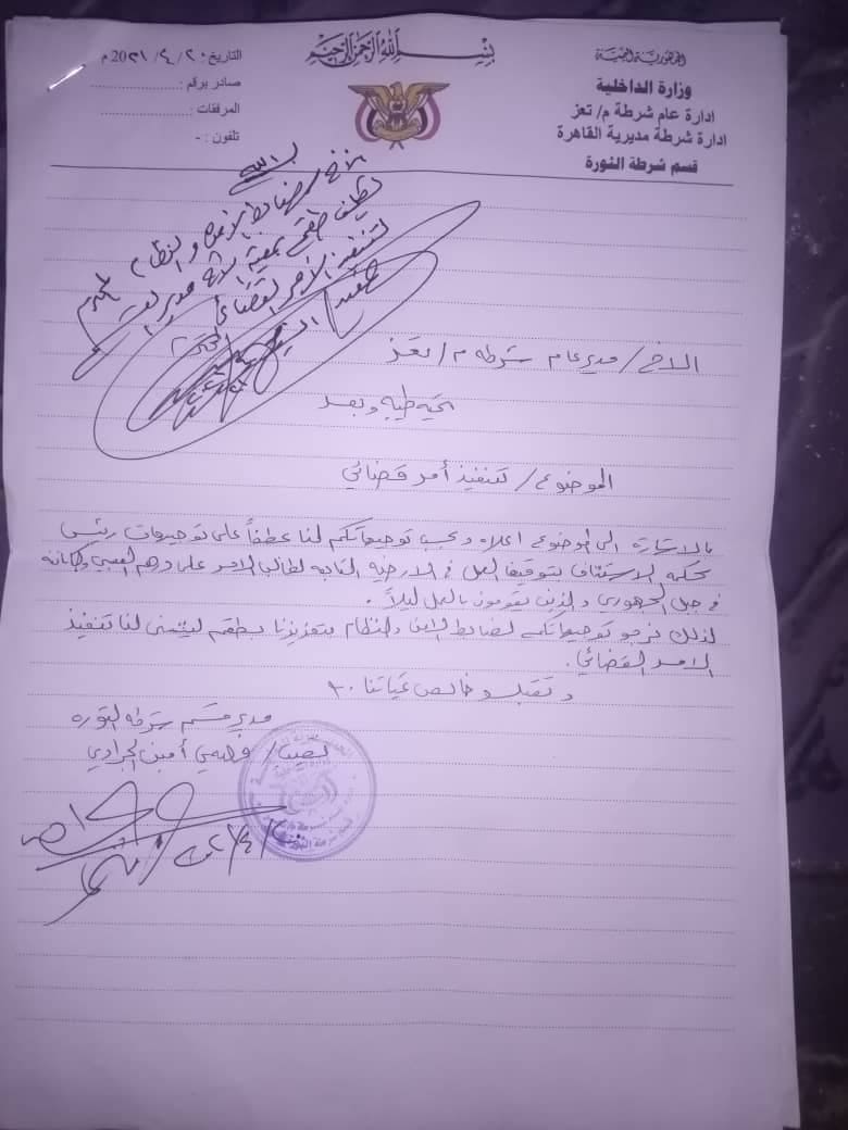 قائد محور تعز يرفض توجيهات المحافظ والقضاء بإيقاف «نهاب أراضي المواطنين» (وثائق)