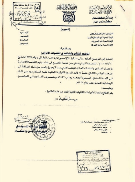 وانتشرت في وسائل التواصل الاجتماعي، الثلاثاء 22 يونيو 2021، توجيهات صادرة من محافظ صنعاء التابع للمليشيا، المدعو عبدالباسط الهادي، ومدير الأمن المعين من الحوثي يحيى المؤيدي، لمديري عموم المديريات ورؤساء المجالس المحلية في صنعاء، للحد من ما أسموها بظاهرة الفنانين والفنانات في المناسبات والأعراس.