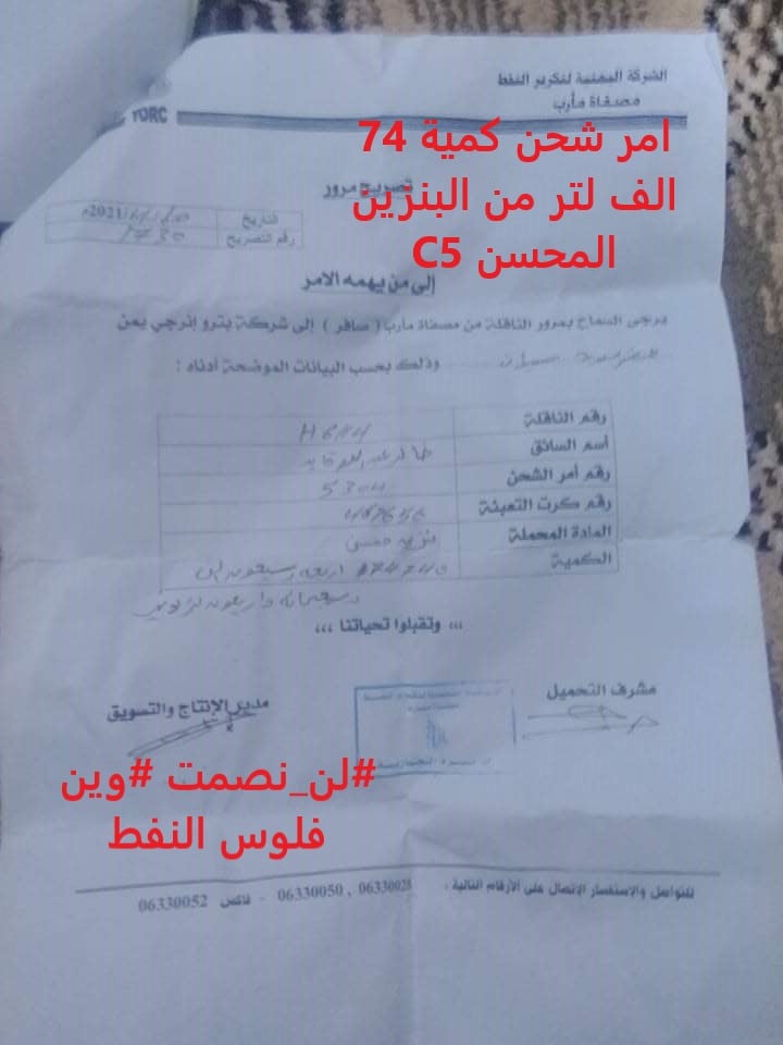 وكشفت أحد الوثائق التي ينشرها «الموقع»، أنه في يوم 21\6\2021، عن أوامر الشحن بكمية 591 الف لتر بنزين محسن.