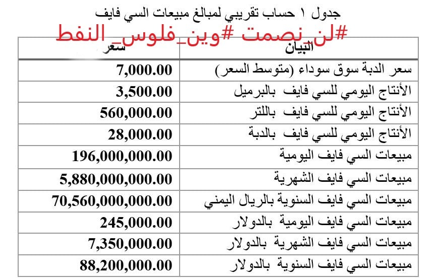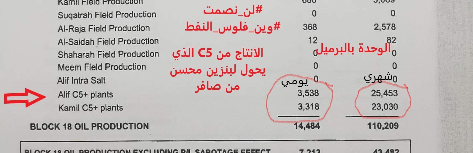 وأوضحت الكشوفات، أن الإنتاج اليومي من البنزين المحسن (C5) من صافر، يبلغ 3300 – 3500 برميل.