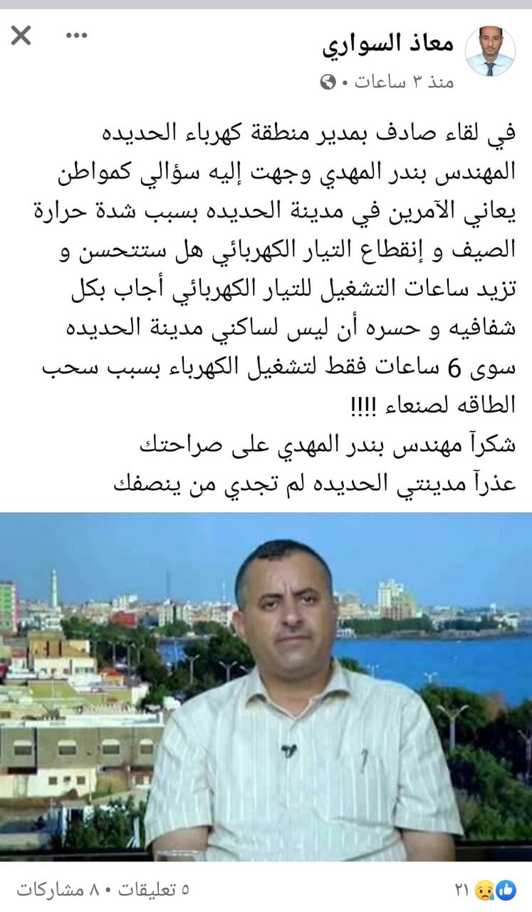 ونشر معاذ السواري، وهو أحد مواطني الحديدة، منشور له بالفيس بوك، تؤكد صحة الأنباء التي تفيد أن الحوثيين سحبوا الطاقة الكهربائية من الحديدة إلى صنعاء، بالقول إنه سأل مدير الكهرباء المهندس بندر المهدي، كمواطن يعني الأمرين بسبب شدة حرارة الصيف وانقطاع التيار الكهربائي، عن موعد تحسن التيار الكهربائي.