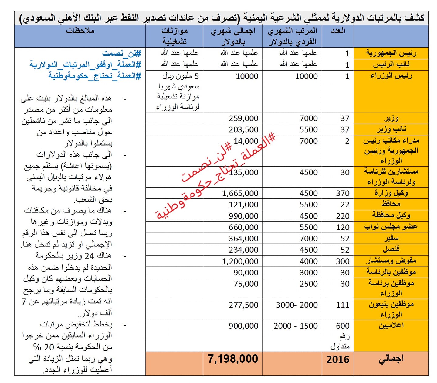 ونشرت حملة «لن نصمت» على صفحته في الفيس بوك، إن مرتبات عدد من أعضاء الشرعية يتسلمون شهريًا 7 مليون دولار صافية، غير البدلات والمكافآت، مشيرًا إلى أنه رقم كبير سيغطي 27 ألف موظف بمعدل 100 ألف ريال للموظف شهريًا.