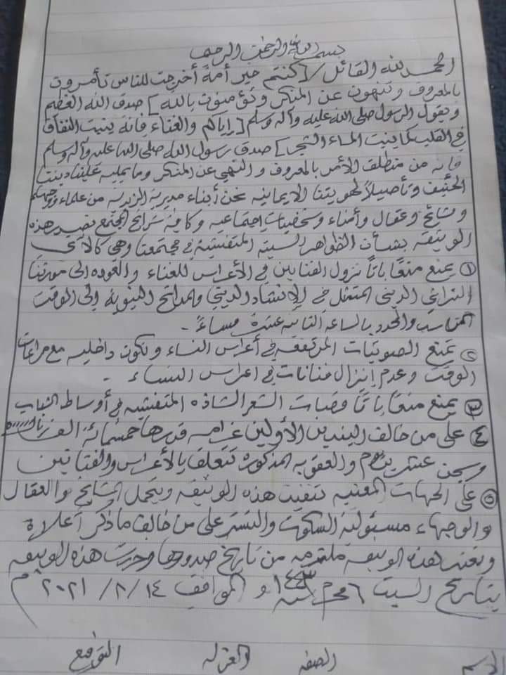 كما تضمنت الوثيقة أن “يمنع منعا باتا قصات الشعر الشاذة المتفشية في أوساط الشباب”.