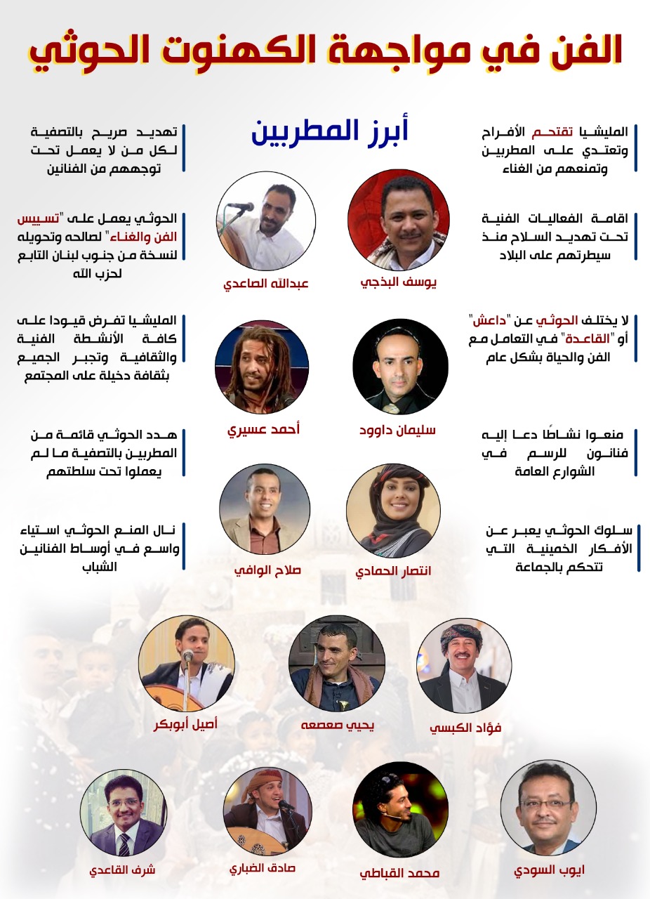 الأكثر من ذلك هو تهديهم لقائمة من الفنانين والمطربين بالتصفية الجسدية، مالم يعملوا تحت سلطتهم والتي شملت نحو 15 فناناً ومغنيا وهم: “يوسف البدجي، أصيل علي أبو بكر، يحيى صعصعة، فؤاد الكبسي، شرف القاعدي “رئيس نادي المطربين اليمنيين” (تهديده بالتصفية في حال ممارسته الغناء)، انتصار الحمادي (عارضة أزياء وممثلة)، عازف العود عبد الله الصاعدي، فنان الراب محمد القباطي، أحمد عسيري عازف وفنان، الفنان عبد الله الصعدي، الممثل صلاح الوافي، أيوب السودي، صادق الضبري، الممثل داؤود سليمان المعروف بـ”كشكوش”.