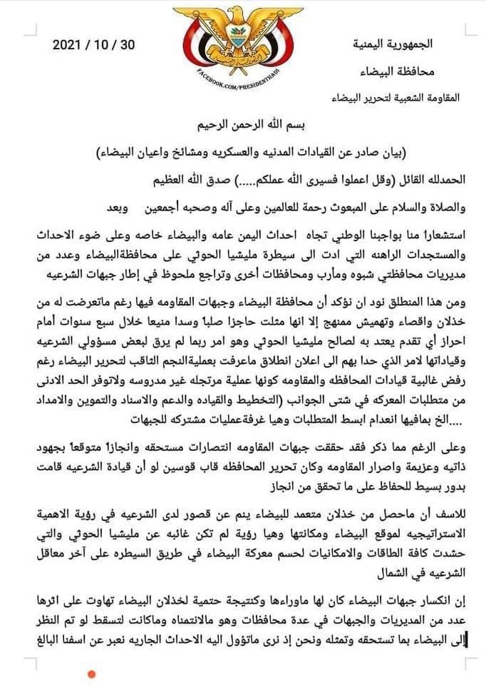 واعتبر البيان أن انكسار جبهات البيضاء كان لها ما وراءها وكنتيجة لخذلان المحافظة تهاوت على أثرها عدد من المديريات والجبهات في عدة محافظات.