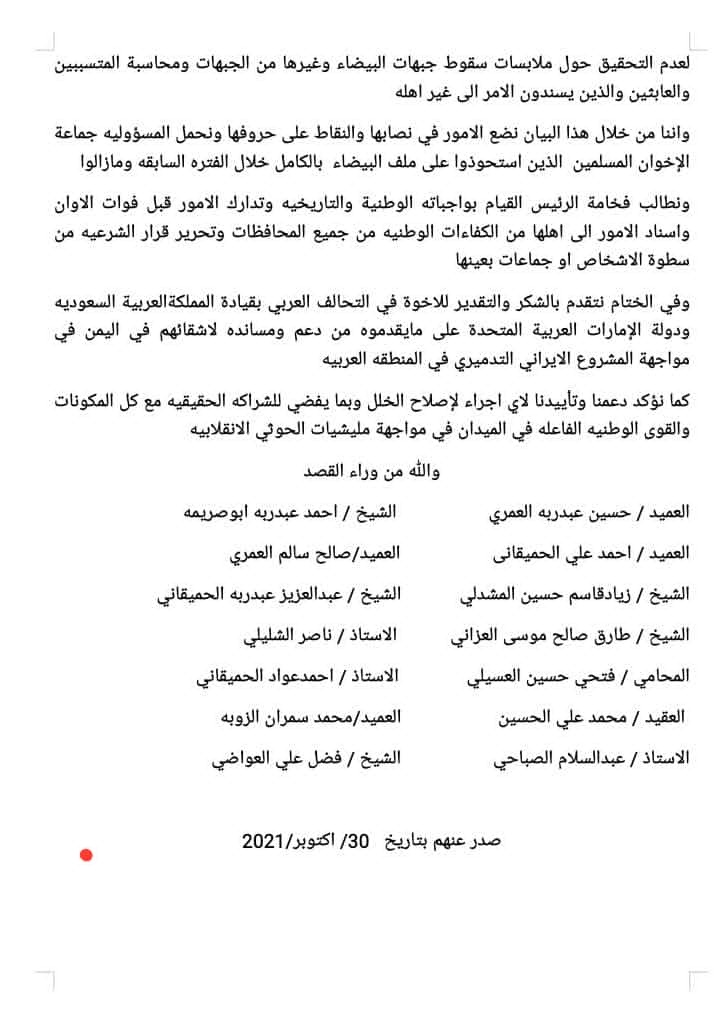 وحمل البيان جماعة الإخوان المسلمين الذين استحوذوا على ملف البيضاء بالكامل خلال الفترة السابقة وما زالوا مسئولية الإخفاقات العسكرية المتتالية وخصوصًا سقوط محافظة البيضاء.