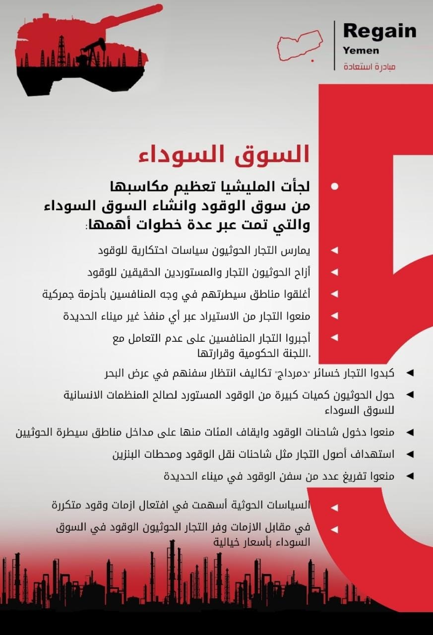 وضم التقرير قائمة سوداء تحتوي على أسماء الجهات والقيادات الحوثية والشركات التجارية والمصارف المتورطة في تزويد الحوثيين بتجارة النفط وغسل الأموال، إضافة إلى أن التقرير احتوى على مجموعة من المعلومات والتفاصيل الخاصة بالسوق السوداء وكيفية إدارتها من قبل الحوثيين.