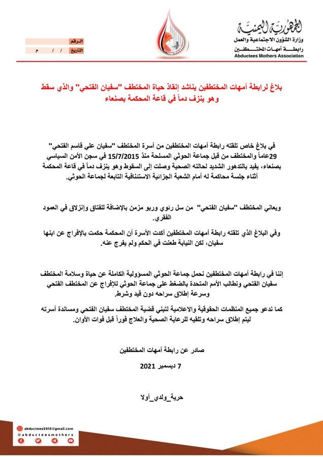 وأكدت “رابطة أمهات المختطفين اليمنيين”، في بيان لها الثلاثاء 7 ديسمبر 2021، أنها “تلقت بلاغاً من أسرة سفيان علي قاسم الفتحي (29 عاماً) والمختطف من قبل جماعة الحوثي المسلحة منذ 15 يوليو 2015 في سجن الأمن السياسي بصنعاء، يفيد بالتدهور الشديد لحالته الصحية وصلت إلى السقوط وهو ينزف دماً في قاعة المحكمة أثناء جلسة محاكمة له أمام الشعبة الجزائية الاستئنافية التابعة لجماعة الحوثي”.