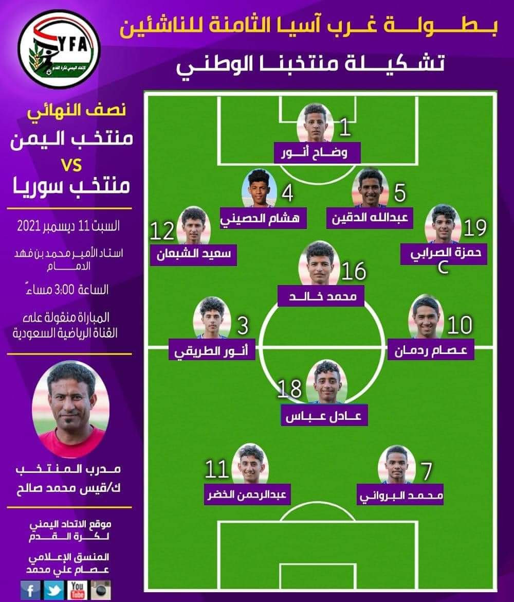 وكان المنتخب اليمني للناشئين قد واصل مسلسل نتائجه القوية في بطولة غرب آسيا، المقامة في السعودية، حيث هزم نظيره السوري (2-1) في نصف النهائي.