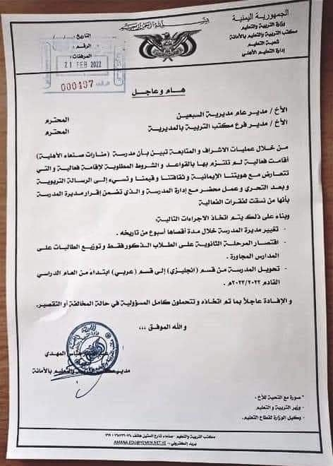 ووجهت الميليشيا مدير مديرية “السبعين” ومدير مكت التربية بالمديرية، بـ “تغيير مديرة المدرسة خلال مدة أقصاها أسبوع من تأريخ التعميم، واقتصار المرحلة الثانوية على الطلاب الذكور فقط، وتوزيع الطالبات على المدارس المجاورة”.