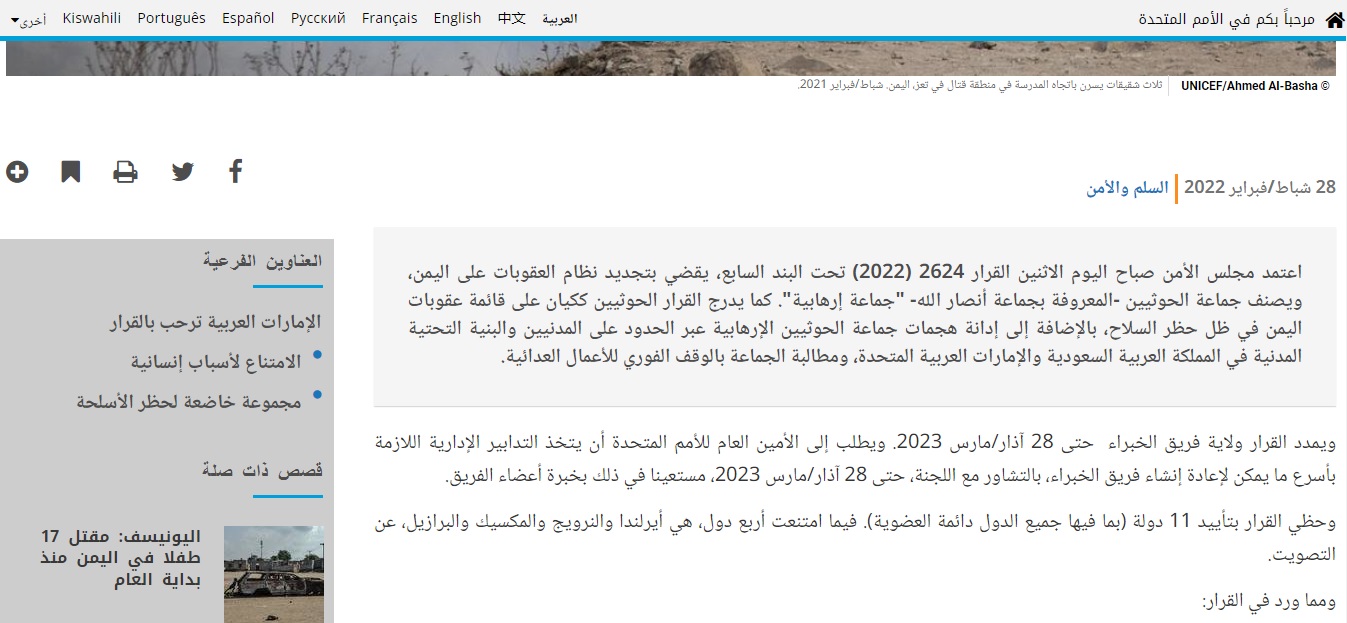 أعتمد مجلس الأمن الدولي، الاثنين 28 فبراير 2022، القرار رقم 2624، تحت البند السابع، بتصنيف مليشيا الحوثية، جماعة إرهابية، بعد محاولات كثيرة وتراجع الولايات المتحدة الأمريكية عن تصنيفها.