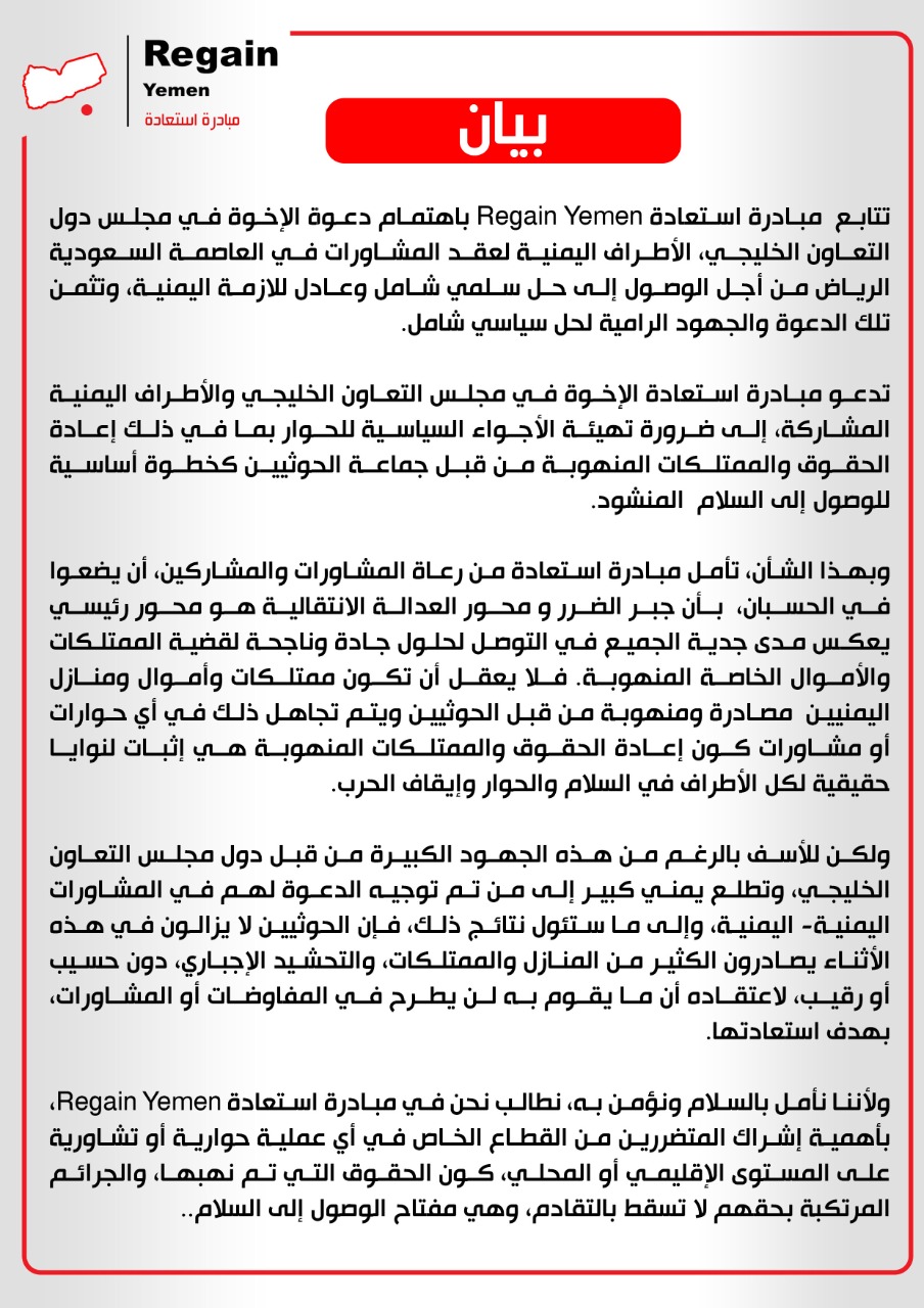 دعت مبادرة Regain Yemen، مجلس دول التعاون الخليجي والمتشاورين في الرياض، إلى ضرورة تهيئة الأجواء السياسية للحوار بما في ذلك إعادة الحقوق والممتلكات المنهوبة من قبل جماعة الحوثيين كخطوة أساسية للوصول إلى السلام المنشود.