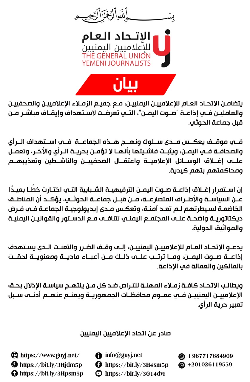 ودعا الاتحاد العام للإعلاميين اليمنيين، في البيان، إلى وقف الضرر والتعنت الذي يستهدف إذاعة صوت اليمن، وما ترتب على ذلك من أعباء مادية ومعنوية لحقت بالمالكين والعمالة في الإذاعة.