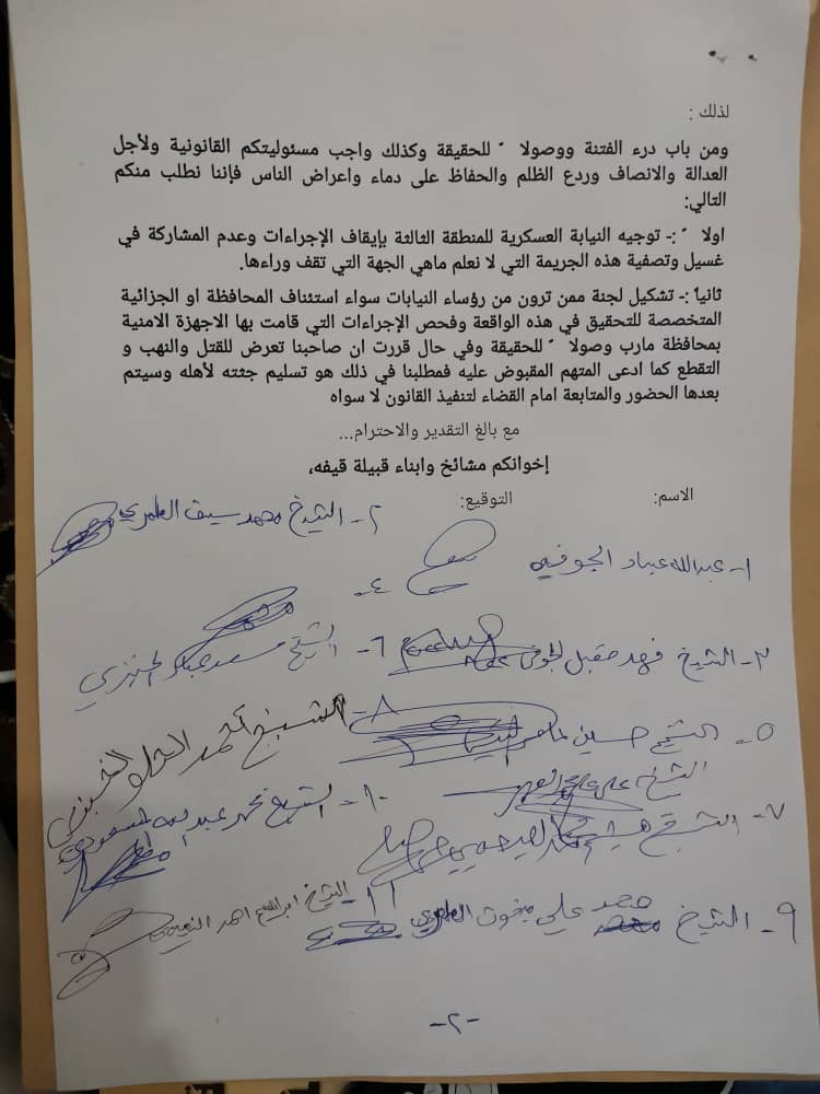 وطالب مشايخ قيفة النائب العام بتشكيل لجنة قضائية من رؤساء النيابة العامة والجزائية المتخصصة بمحافظة مأرب للتحقيق وفحص ملف القضية بعد إلزام النيابة العسكرية للمنطقة الثالثة بإيقاف الإجراءات وسحب الملف منها حتى الوصول إلى حقيقة الواقعة عبر اللجنة التي طالبوا النائب العام بتشكيلها.