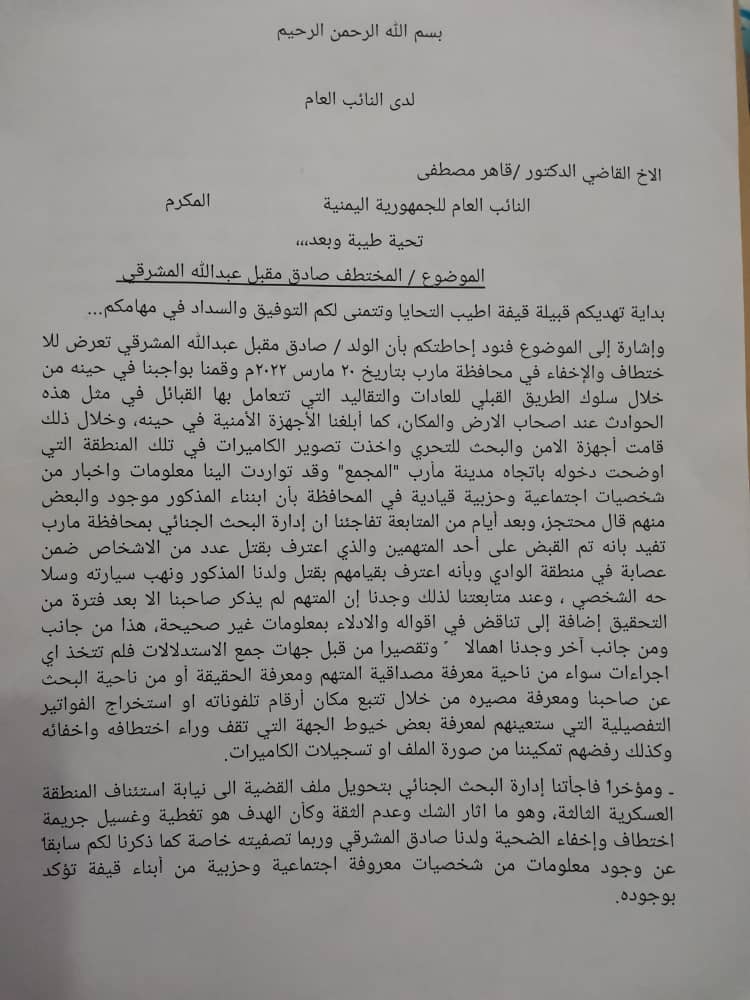 مشائخ قيفة يتهمون حزب الإصلاح بمأرب بتهريب قاتل احد ابنائهم (وثيقة)