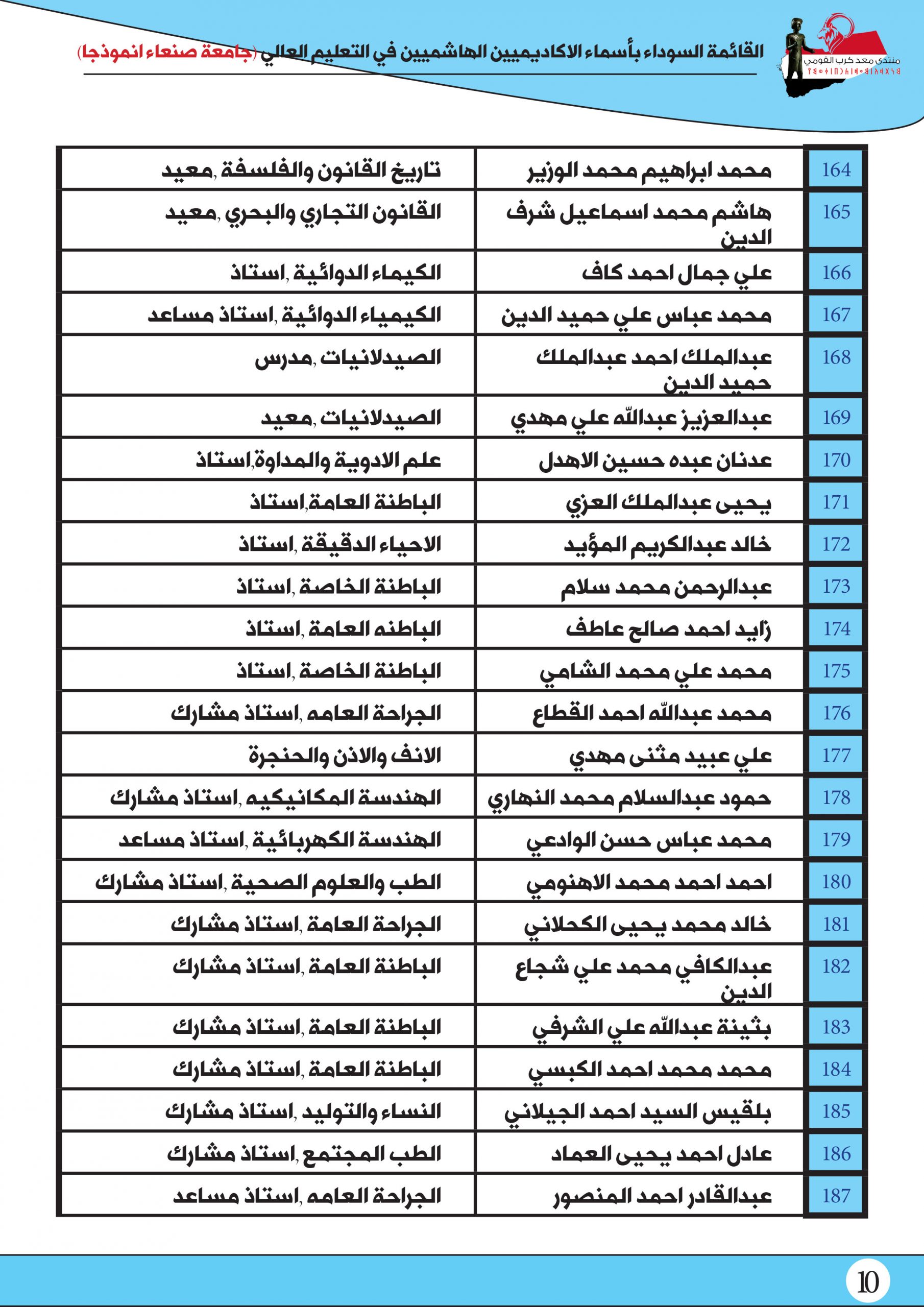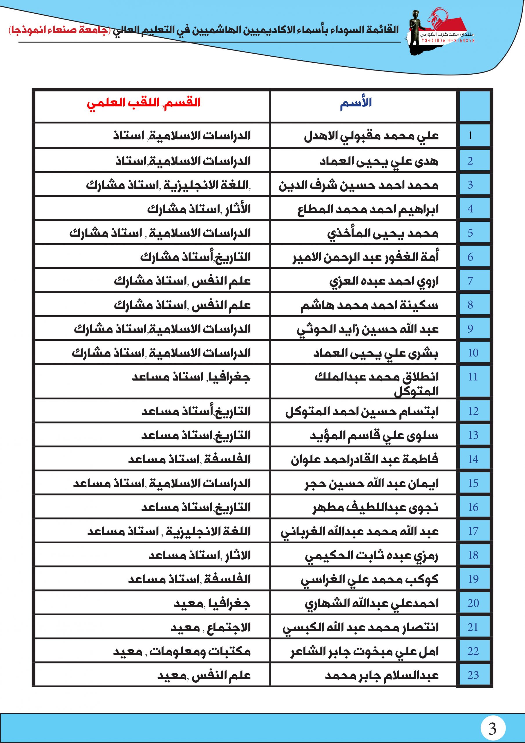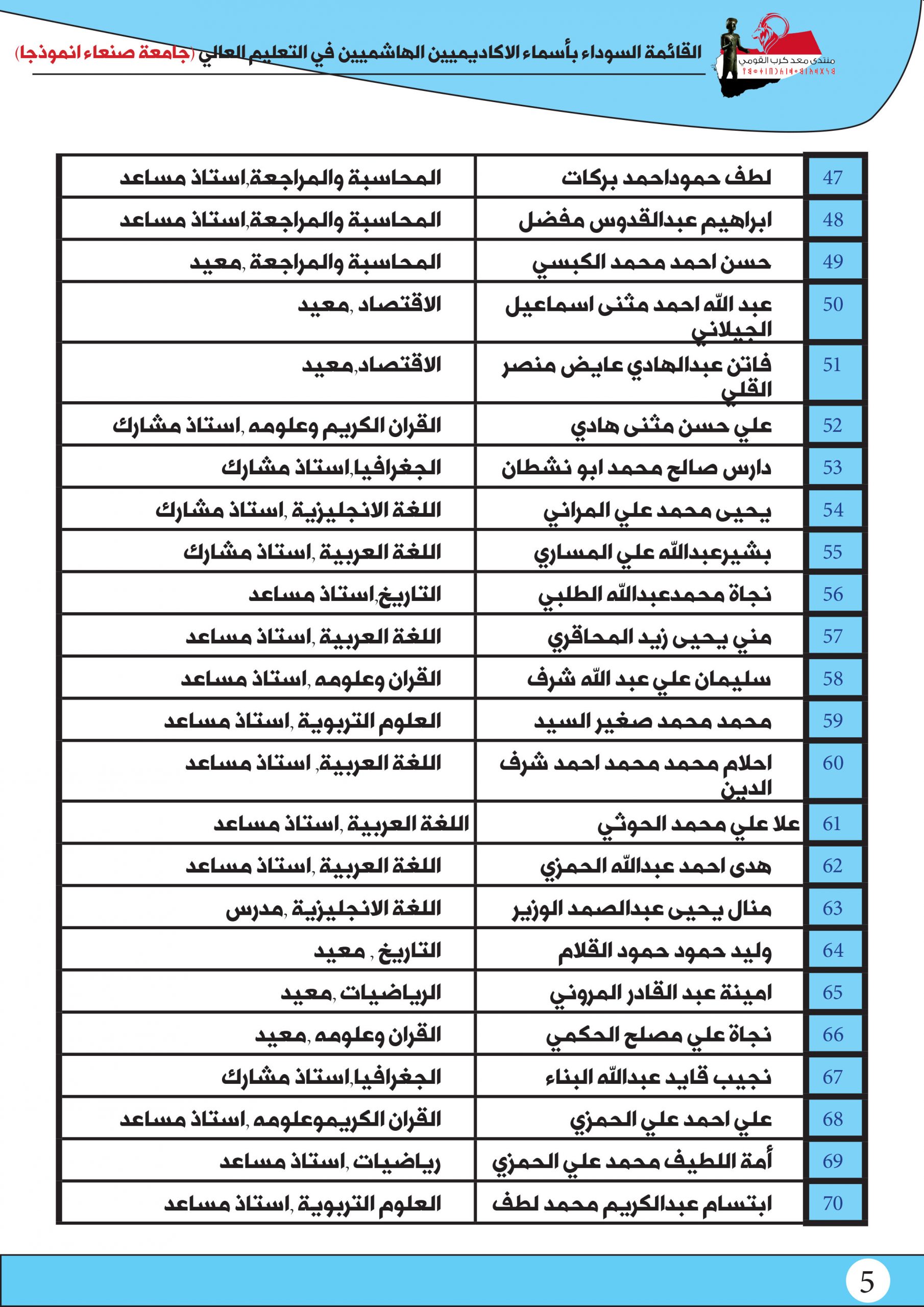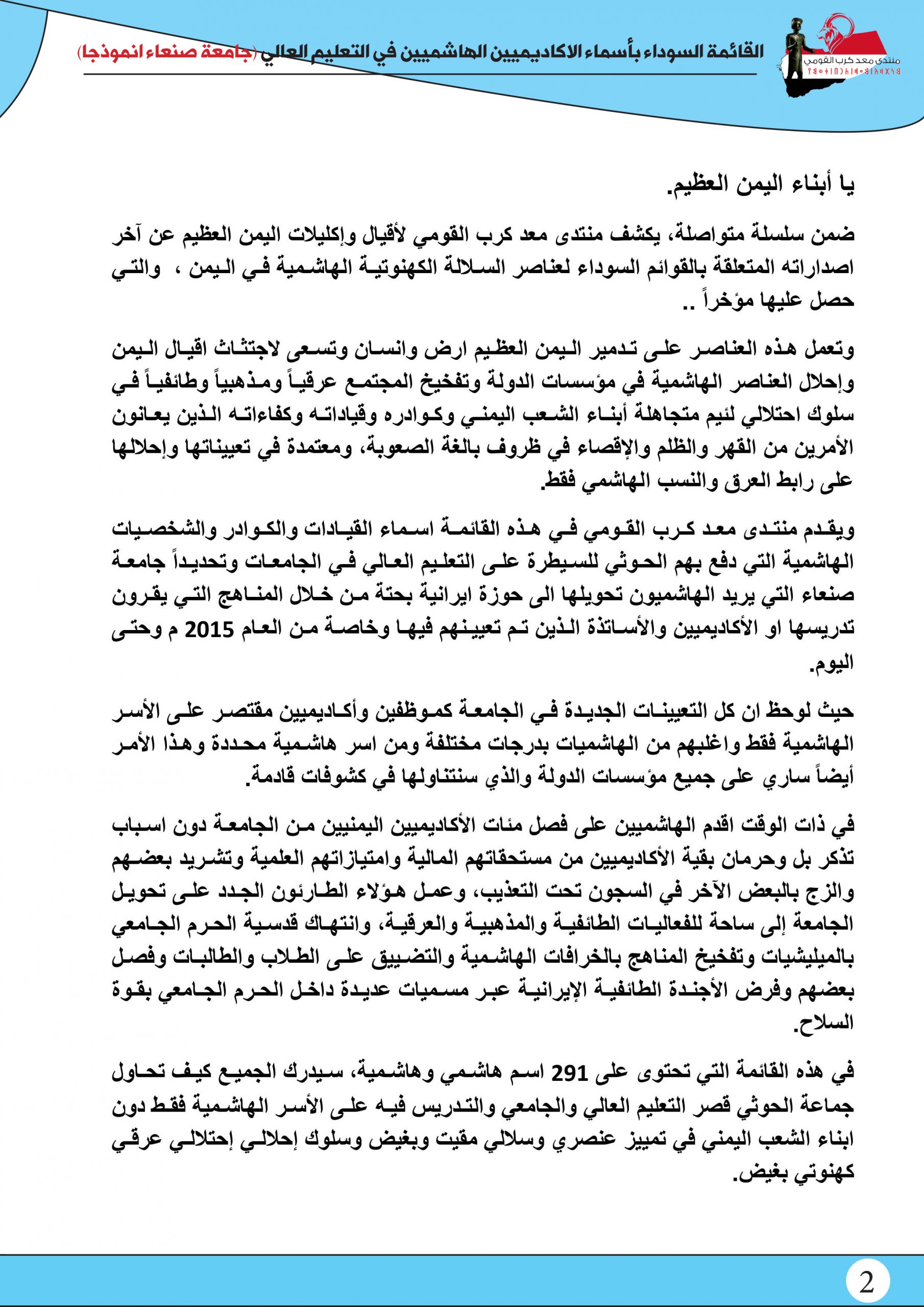 كشف منتدى معد كرب القومي عن قائمة سوداء مكونة من 291 اسمًا لقيادات وكوادر وشخصيات هاشمية دفع بهم الحوثي للسيطرة على التعليم العالي في الجامعات اليمنية وتحديدًا جامعة صنعاء..