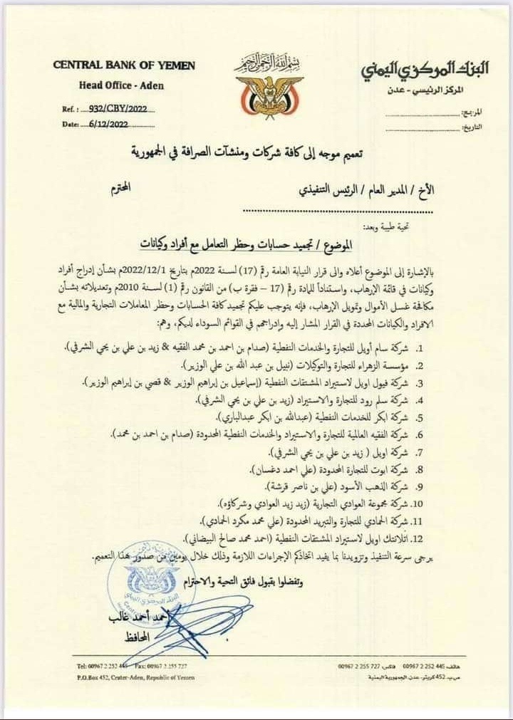 جاء ذلك في تعميم وجهه مساء الثلاثاء، محافظ البنك المركزي أحمد غالب، إلى المدير العام، والرئيس التنفيذي، قضى بايقاف وتجميد حسابات وحظر التعامل مع 12 كيانا وجهة.