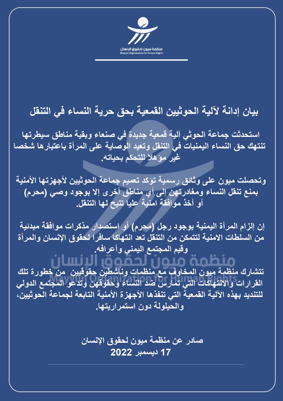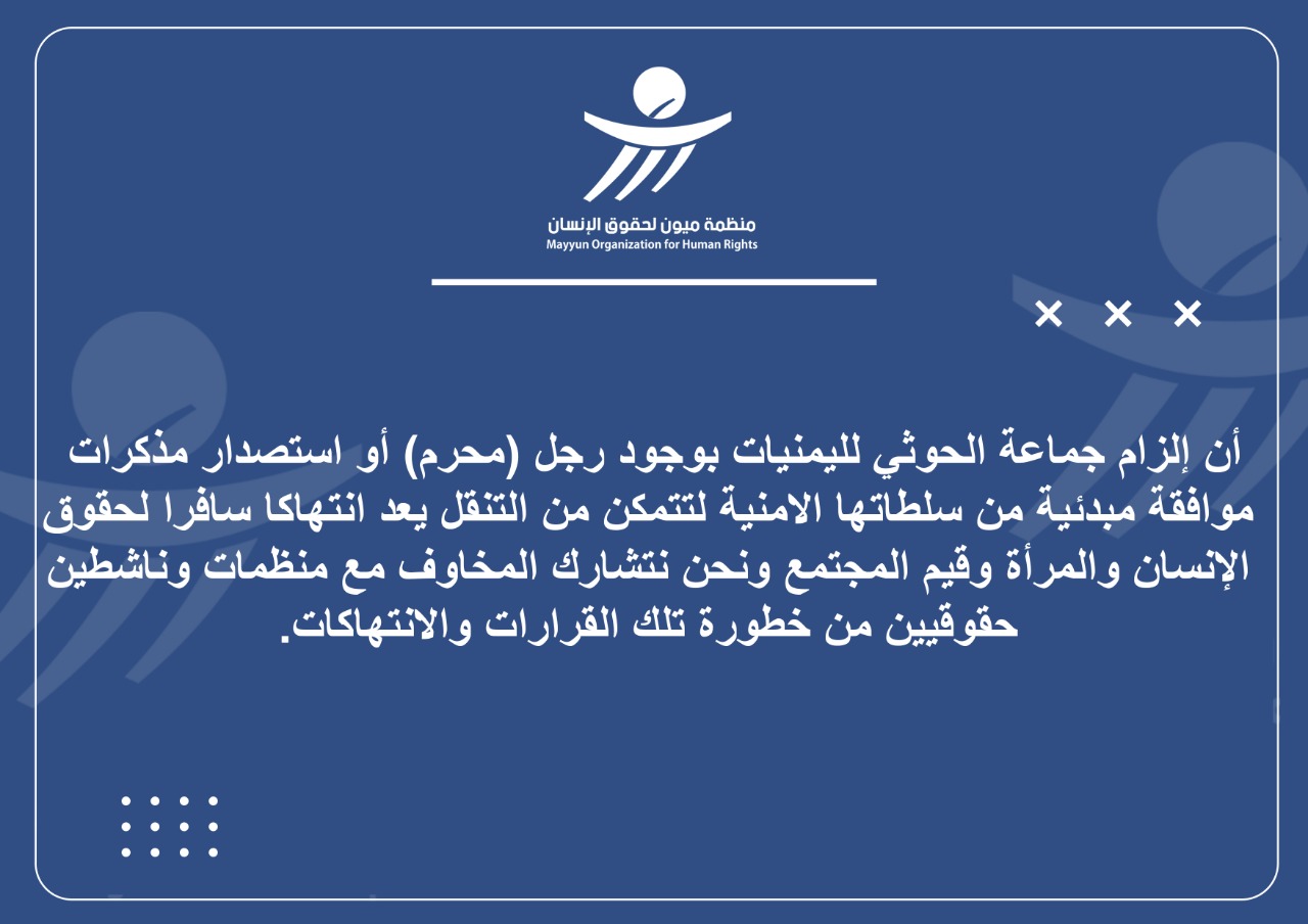 وقالت ميون في بيان صادر السبت 17 ديسمبر 2022، إنها تحصلت على وثائق رسمية تؤكد تعميم جماعة الحوثيين لأجهزتها الأمنية بمنع تنقل النساء ومغادرتهن إلى أي مناطق أخرى إلا بوجود وصي (محرم) أو أخذ موافقة امنية عليا تتيح لها التنقل.