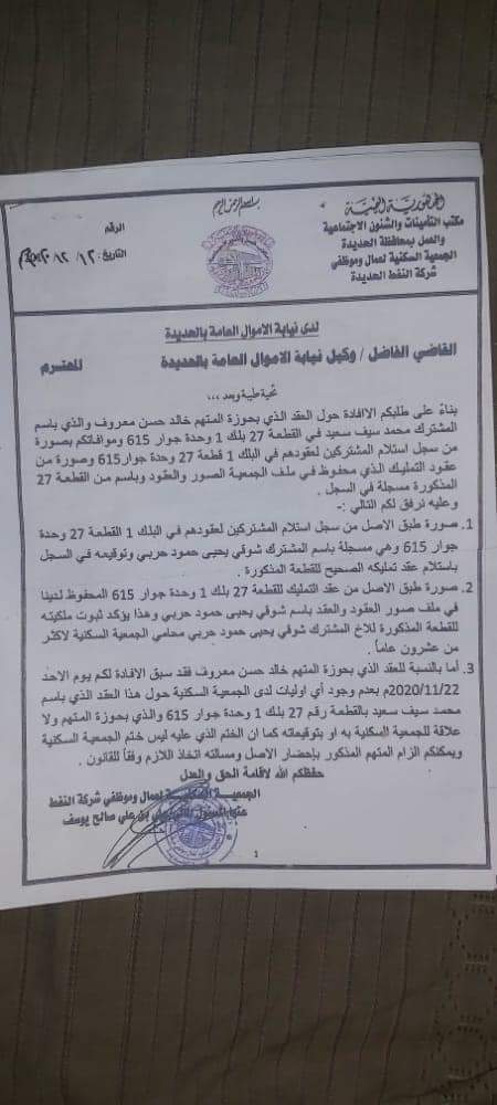 وأظهرت رسالة صادرة عن نيابة الأموال العامة الابتدائية بالحديدة إلى مدير عام مكتب أراضي وعقارات الدولة بالحديدة طلباً بالتوجيه بإيقاف تسجيل أو توثيق أو نقل ملكية أي عقد تمليك لأراضي الجمعية السكنية لعمّال وموظّفي شركة النفط اليمنية باسم خالد حسن معروف أو أقربائه. كما طلبت النيابة صور وثائق نقل الملكية وعقود التمليك التي سجّلها معروف لقطع أراضي الجمعية لثمانية مشتركين، علماً بأنه سجّل أكثر من عقدين باسم كل مشترك.