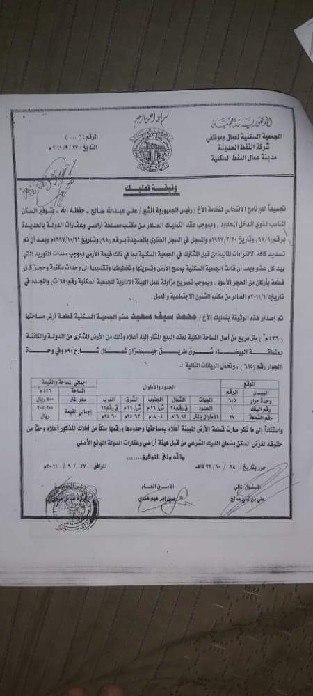 وكانت وثيقة صادرة عن مدينة عمّال النفط السكنية أوضحت إصدار مكتب أراضي وعقارات الدولة بالحديدة عقداً عام 1997 بتمليك شوقي يحيى حمود حربي عضو الجمعية السكنية قطعة أرض بمنطقة البيضاء بالحديدة، في إطار البرنامج الانتخابي للزعيم الشهيد علي عبد الله صالح بهدف توفير السكن المناسب لذوي الدخل المحدود.