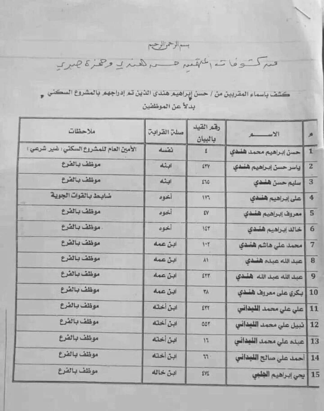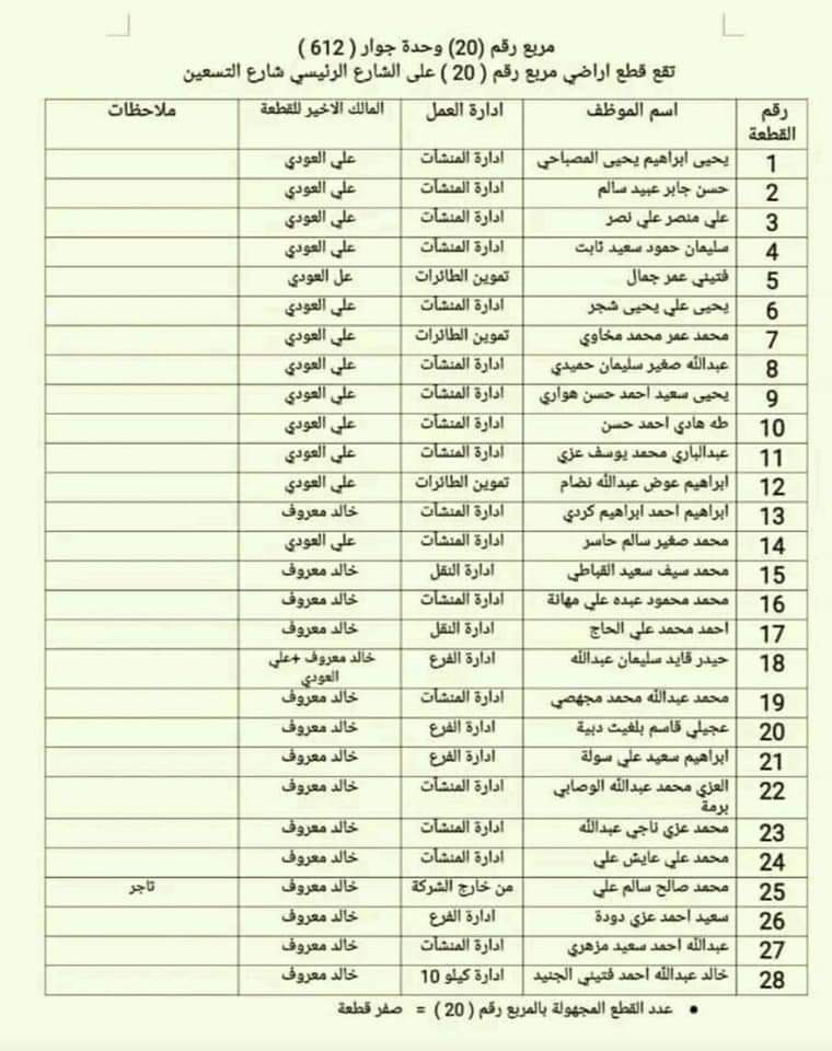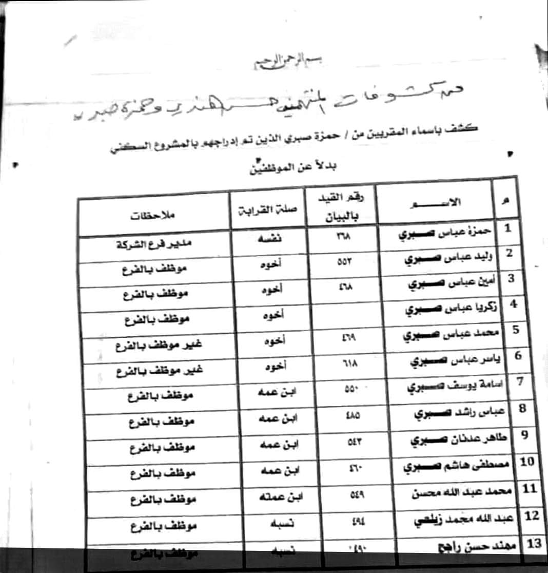 وبيّنت كشوفات رسمية أسماء عشرات المقرّبين من رئيس النقابة والأمين العام للجمعية حسن إبراهيم هندي ومدير شركة النفط السابق حمزة صبري تم إدراجهم بالمشروع السكني بدلاً عن الموظّفين.