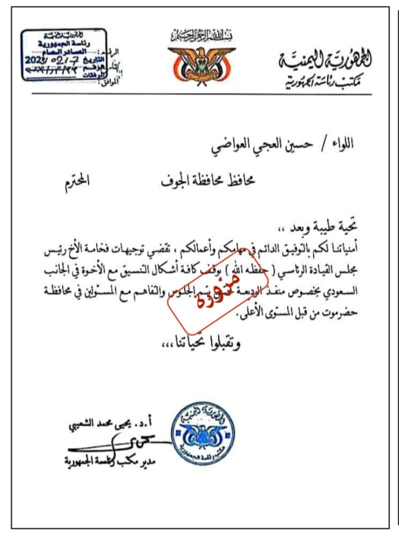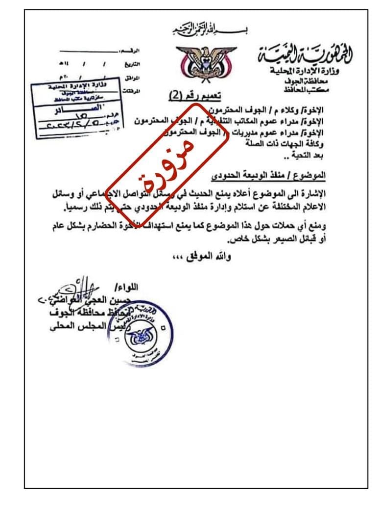 نفى محافظ الجوف اللواء حسين العجي العواضي صحة المزاعم التي روجت لها وسائل إعلام وناشطين تابعين لجماعة الاخوان بفصل منفذ الوديعة عن محافظة حضرموت وضمه للجوف، عقب تدشين العواضي لعمله من داخل المنفذ.