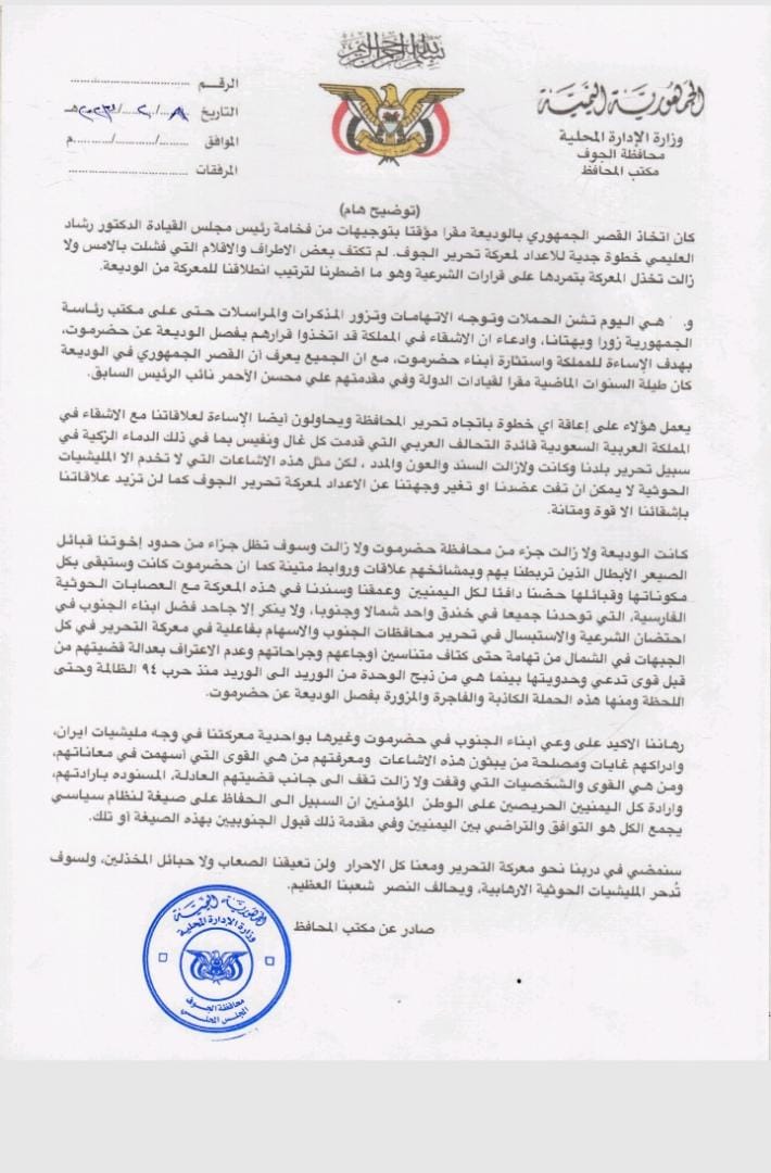 وأشاد محافظ الجوف بدور “ابناء الجنوب في احتضان الشرعية والاستبسال في تحرير محافظات الجنوب والإسهام بفاعلية في معركة التحرير في كل الجبهات في الشمال من تهامة حتى كتاف متناسين أوجاعهم وجراحاتهم وعدم الاعتراف بعدالة قضيتهم من قبل قوى تدعي وحدويتها بينما هي من ذبح الوحدة من الوريد الى الوريد منذ حرب ٩٤ الظالمة وحتى اللحظة ومنها هذه الحملة الكاذبة والفاجرة والمزورة بفصل الوديعة عن حضرموت” ، في إشارة إلى جماعة الإخوان المسلمين.