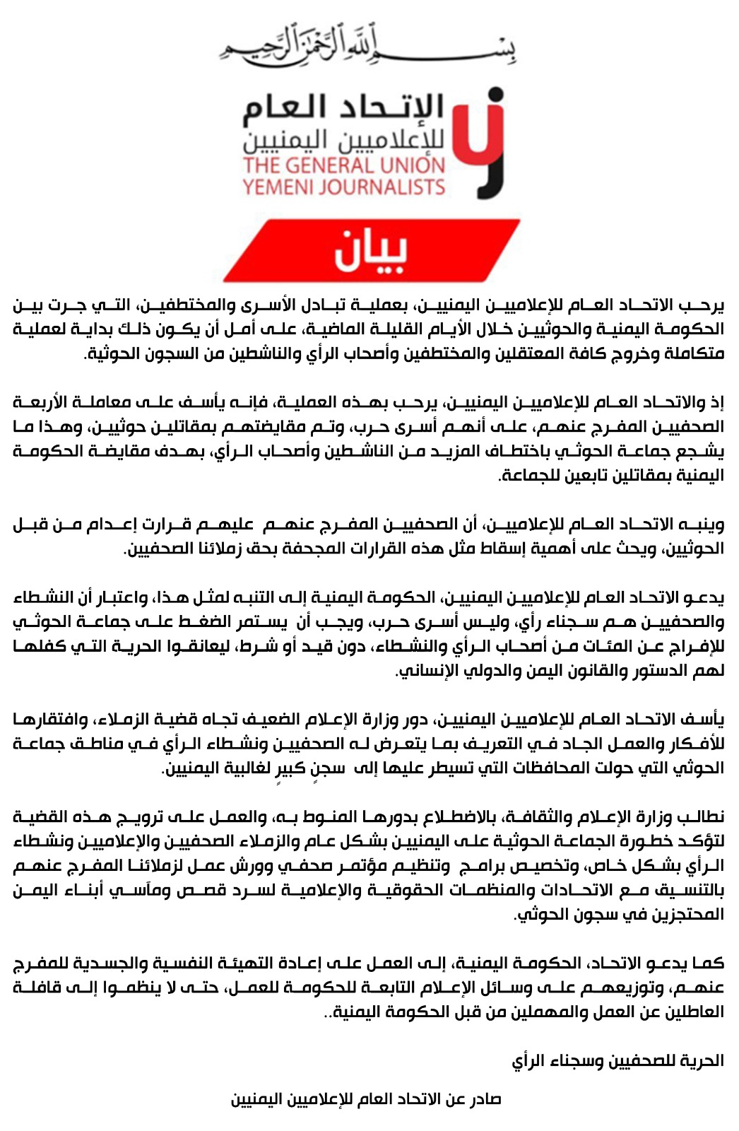 ودعا الاتحاد العام للإعلاميين اليمنيين، الحكومة اليمنية إلى التنبه لمثل هذا، واعتبار أن النشطاء والصحفيين هم سجناء رأي، وليس أسرى حرب، ويجب أن يستمر الضغط على جماعة الحوثي للإفراج عن المئات من أصحاب الرأي والنشطاء، دون قيد أو شرط، ليعانقوا الحرية التي كفلها لهم الدستور والقانون اليمن والدولي الإنساني.