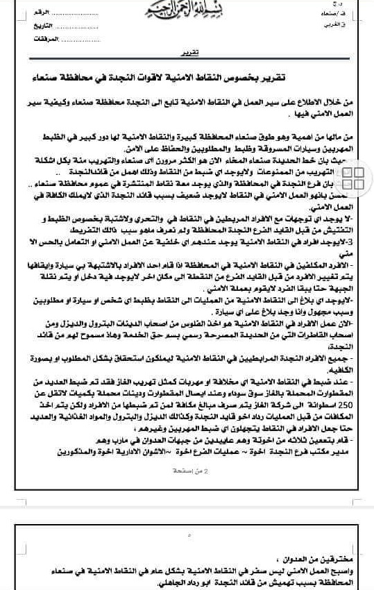 وتضمن التقرير السري، اتهام القيادي “نعمان المطري” قائد فرع مايسمى قوات النجدة محافظة صنعاء بالاهمال في عمليات الضبط بخط الحديدة صنعاء وتحوله الى خط مفتوح لتهريب الممنوعات، وفرض أفراده الجبايات على سائقي ناقلات الوقود المصرح لها القادمة من الحديدة، ناهيك عن تعيينه ثلاثة من اخوته المخترقين والعائدين من جبهات ما اسموه “العدوان” مدير مكتبه ومديرا للعمليات والشؤون الادارية، وقضايا أخرى -حسب التقرير.