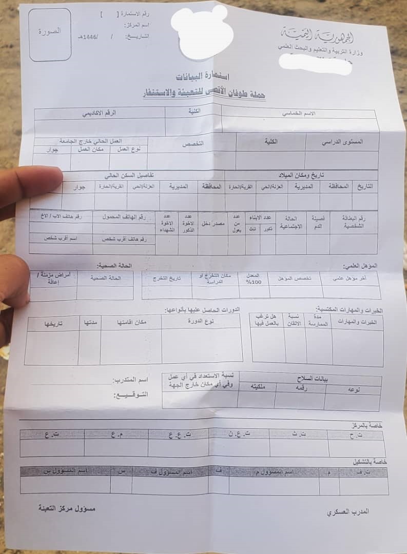 وحصل الموقع على وثيقة صادرة من قبل وزارة التربية والتعليم التي تديرها المليشيا الحوثية، تطالب بمعلومات شخصية متعددة من الطلاب تحت عنوان «حملة طوفان الأقصى للتعبئة والاستنفار»، مثل البيانات الدراسية، والمهارات، والخبرة العملية، إضافة إلى التفاصيل الصحية والاجتماعية.