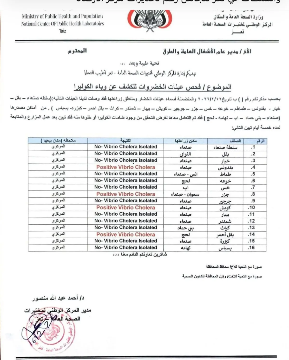 وبحسب الوثيقة، فقد خضعت عينات من خضروات قادمة من صنعاء ومناطق أخرى للفحص خلال الأيام الماضية، حيث أثبتت النتائج وجود بكتيريا «Vibrio Cholera» في عدد من العينات، بينها البقدونس والجزر والكوسة والفلفل الأحمر، وهي منتجات واسعة الاستهلاك في الأسواق المحلية.