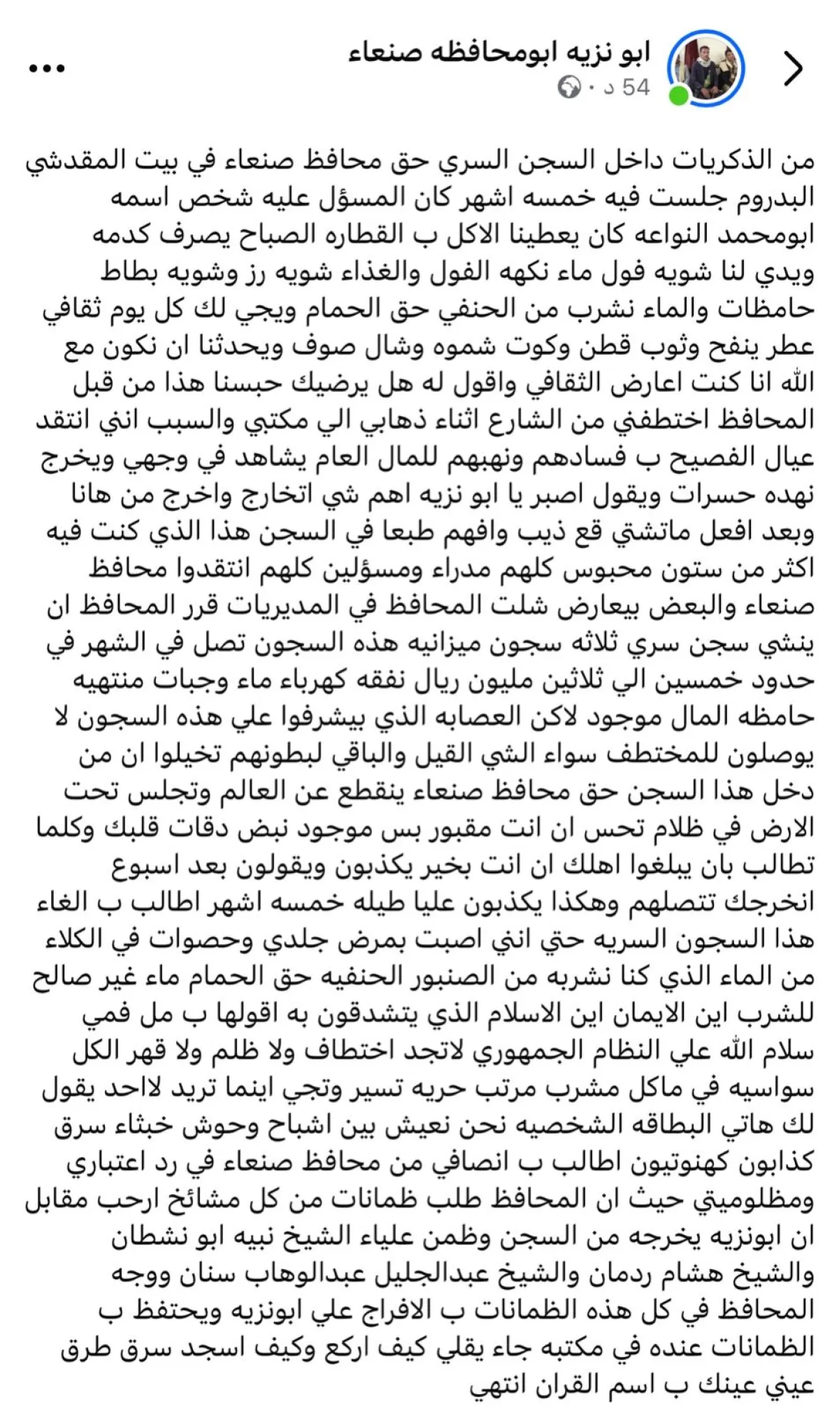 كشف مواطن يمني عن تعرضه للاختطاف والاحتجاز لمدة خمسة أشهر داخل سجن سري يُقال إنه يتبع جهات نافذة في محافظة صنعاء، مشيراً إلى أن اعتقاله جاء على خلفية انتقاده قضايا فساد تتعلق بإدارة المال العام.